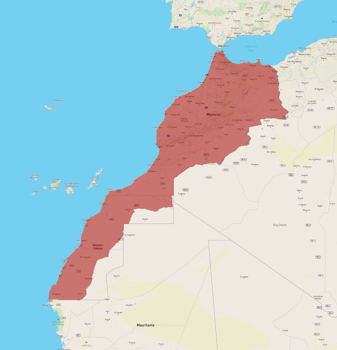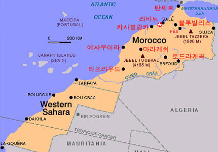 아프리카 북서부 마그레브 지역에 위치한 국가. 동북쪽에는 지중해, 서북쪽과 서쪽에는 대서양에 접한 아랍-베르베르 국가다.