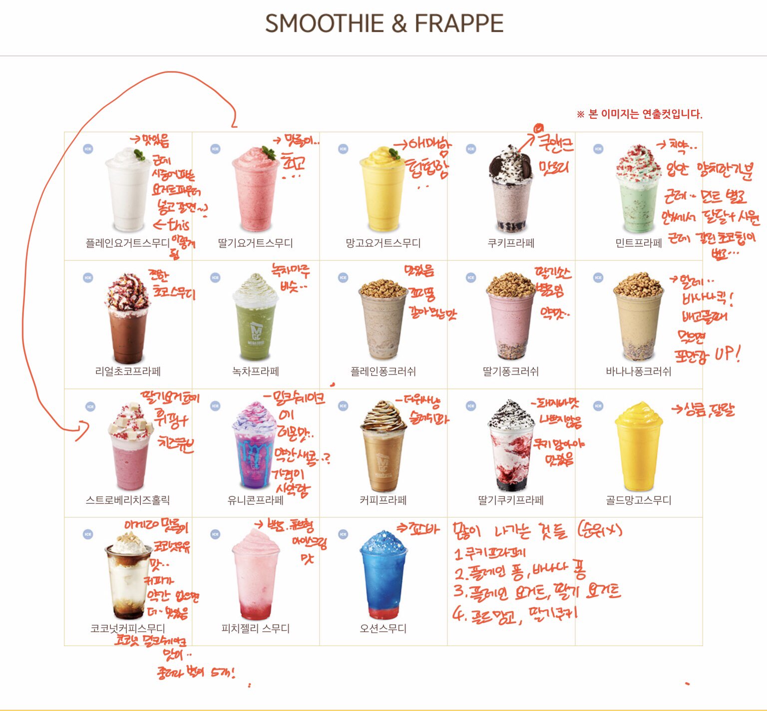 - 플레인 퐁크러쉬: 죠리퐁을 함께 갈아넣은 스무디인데 갈아넣은것으로도 모자라서 맨위에 죠리퐁을 갈지않고 그대로 가득 얹어준다. 맛은 죠리퐁의 달달하고 고소한 그맛이 그대로 나는 편.