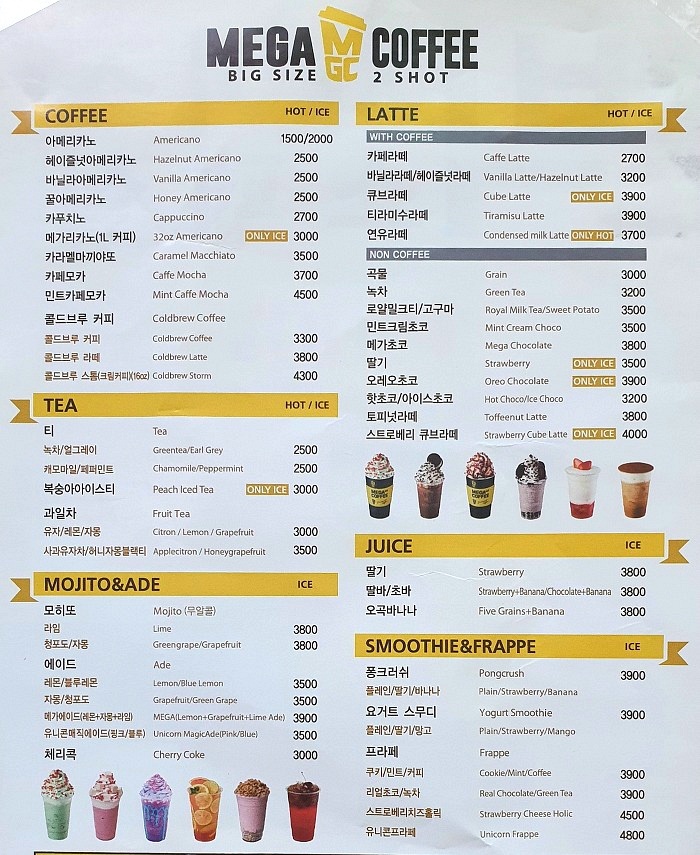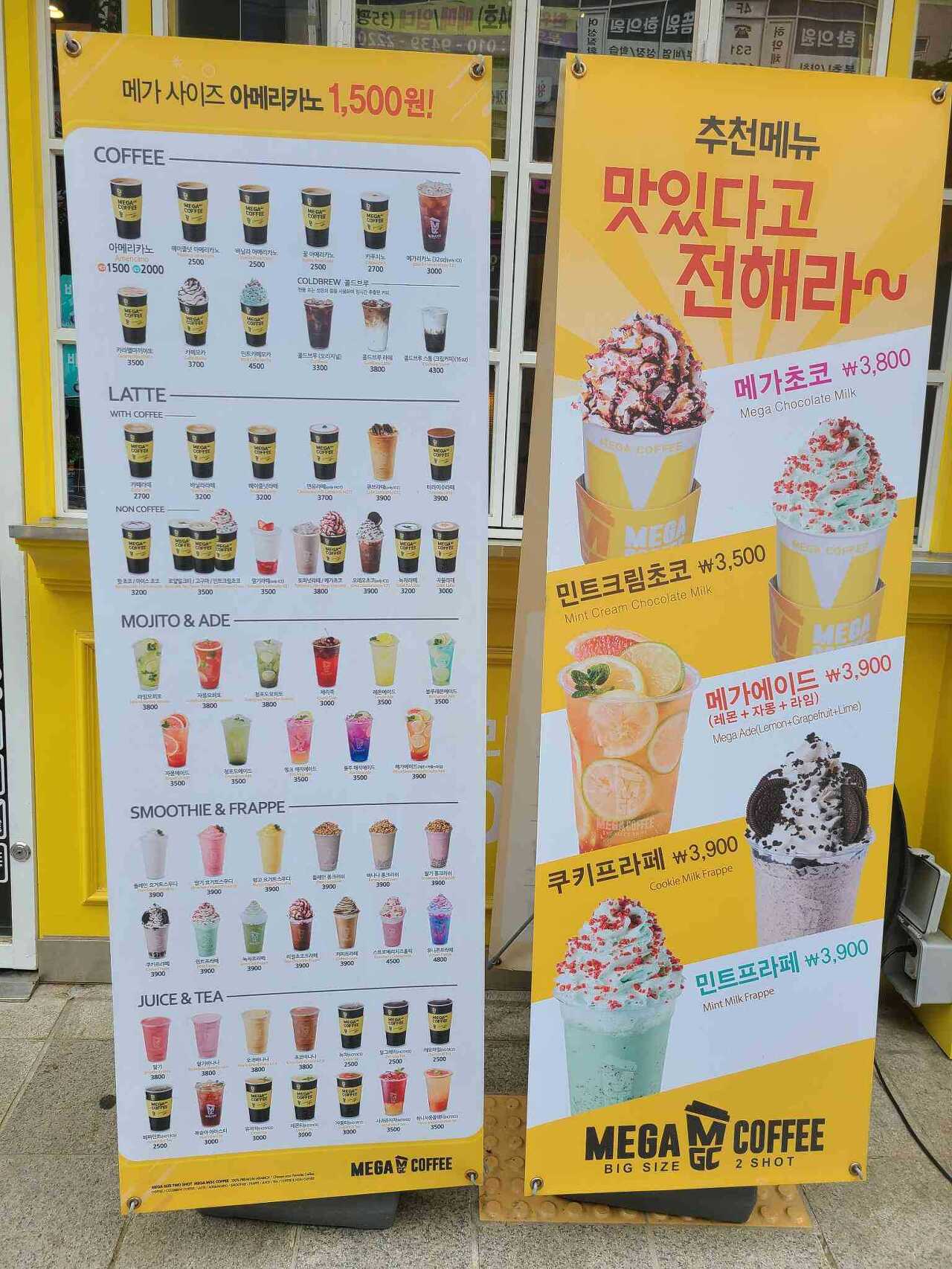 - 메가리카노: 1L짜리 아메리카노, 3샷이 들어간다.