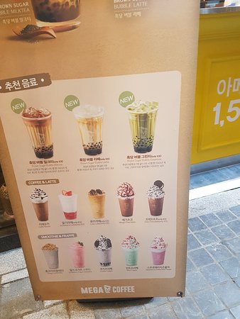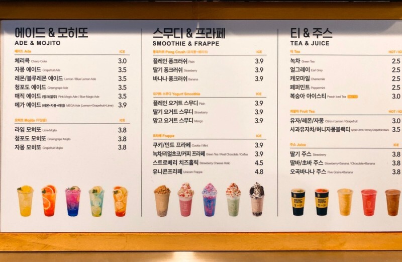 - 메가초코: 아이스 초코에서 휘핑과 토핑이 올라간 메뉴. 간혹가다 휘핑을 빼달라는 주문이 들어오기도 하는데, 이럴경우엔 차라리 500원이 더 저렴한 아이스 초코를 시키는게 낫다.