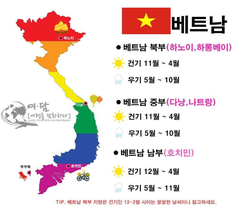 한국에서는 베트남 하면 1년 내내 더운 열대 국가라는 인식이 강하지만, 남북으로 길쭉한 나라인만큼 지역별로 차이가 있다.