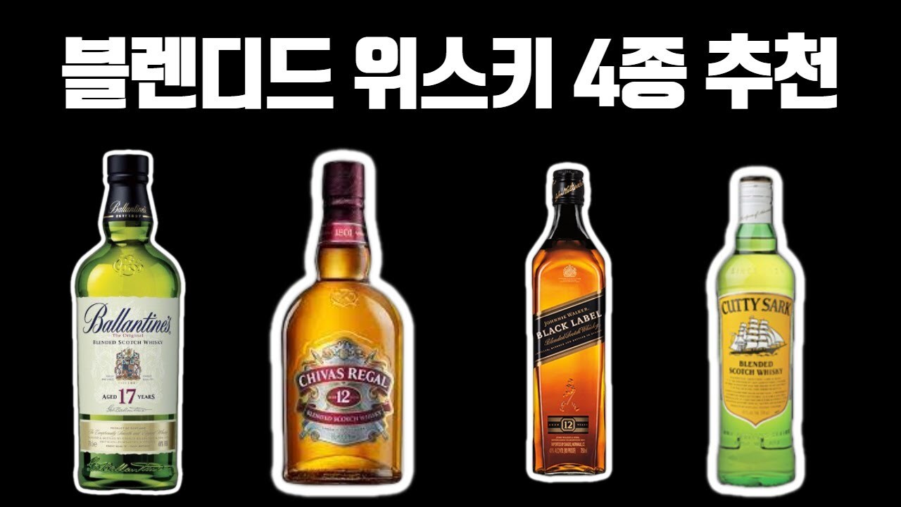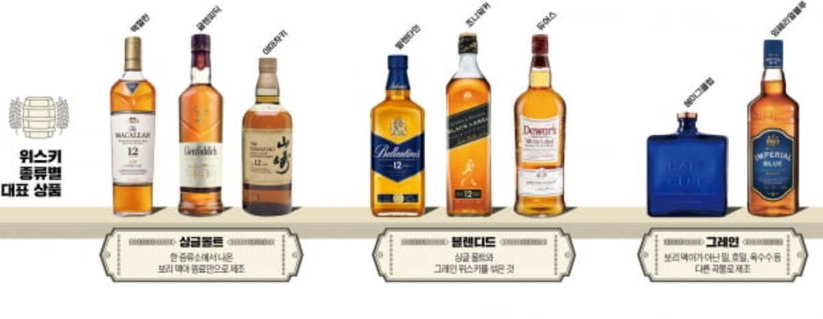 - 블렌디드(blended) 위스키 : 몰트 위스키와 그레인 위스키를 혼합한 것으로 시중에서 가장 일반적인 위스키이다.
