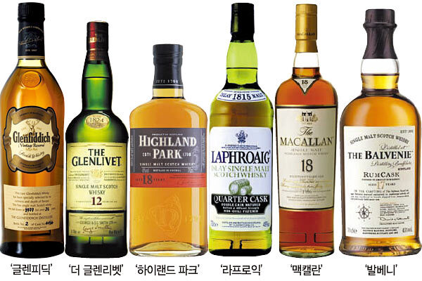 세계적으로 많이 팔리는 싱글 몰트 위스키로는 더 맥켈란, 글렌피딕, 더 글렌리벳, 글렌모렌지 등이 있다.