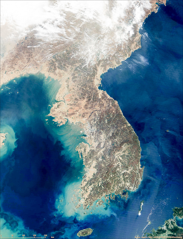 우주에서 본 한반도의 밤 심지어 압록강과 두만강 이북은 그나마 빛이 있는데 북한 쪽은 평양을 제외하면 원산, 함흥, 라선 등 몇 군데 없어서 정말 섬처럼 보인다.
