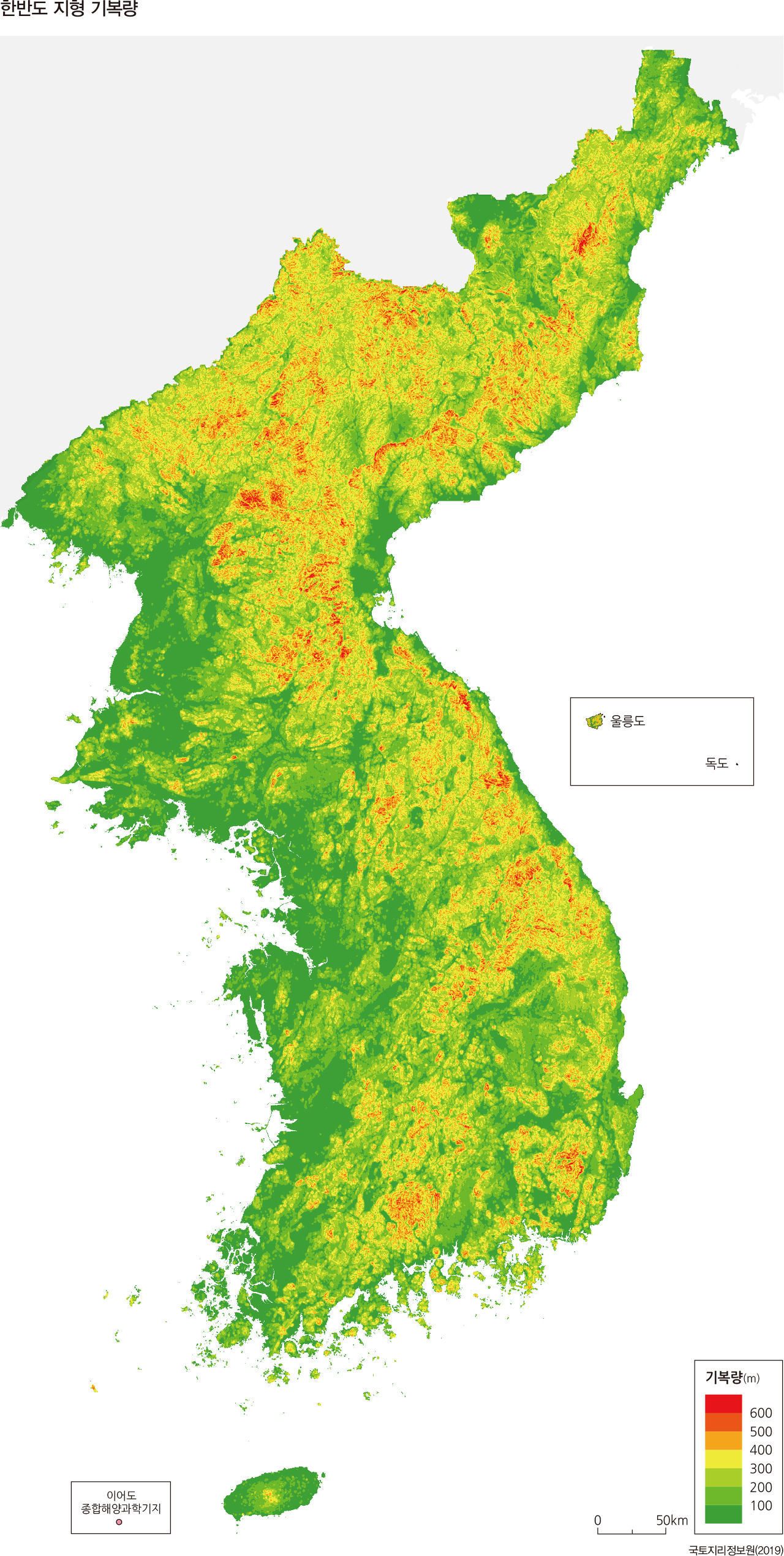 출처는 대한지리학회지 제48권(2013) 1호, pp.1-18, <<지형학적 산지의 분포와 공간적 특성에 관한 연구>>(탁한명 등 3인)에서 나온 것인데 이 논문에 따르면, 남한에서는 산지가 31%, 북한에서는 51%이다.