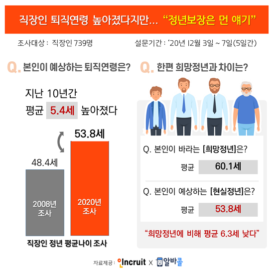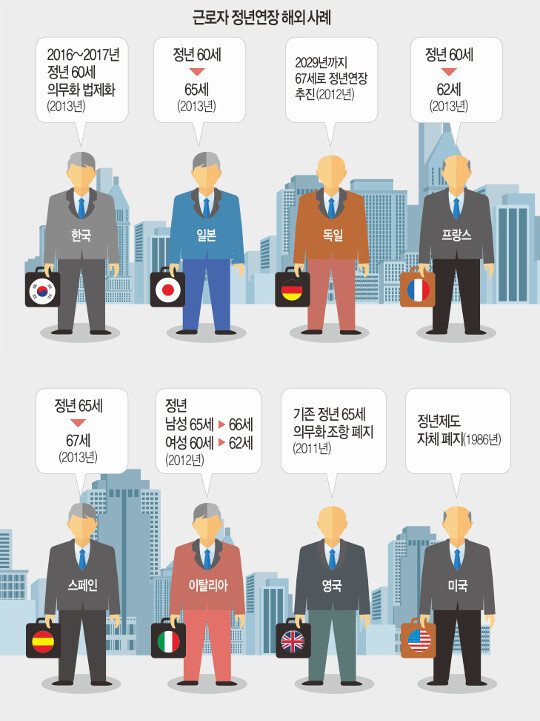 한국의 경우 국민연금의 환급 시기도 점차적으로 65세부터로 늦춰질 것이기 때문에, 정년과 연금 수령 시기간의 갭을 매우기 위해 정년 연장 의견이 더욱 힘을 받고 있지만 아직 논의 단계에 머물고 있다.