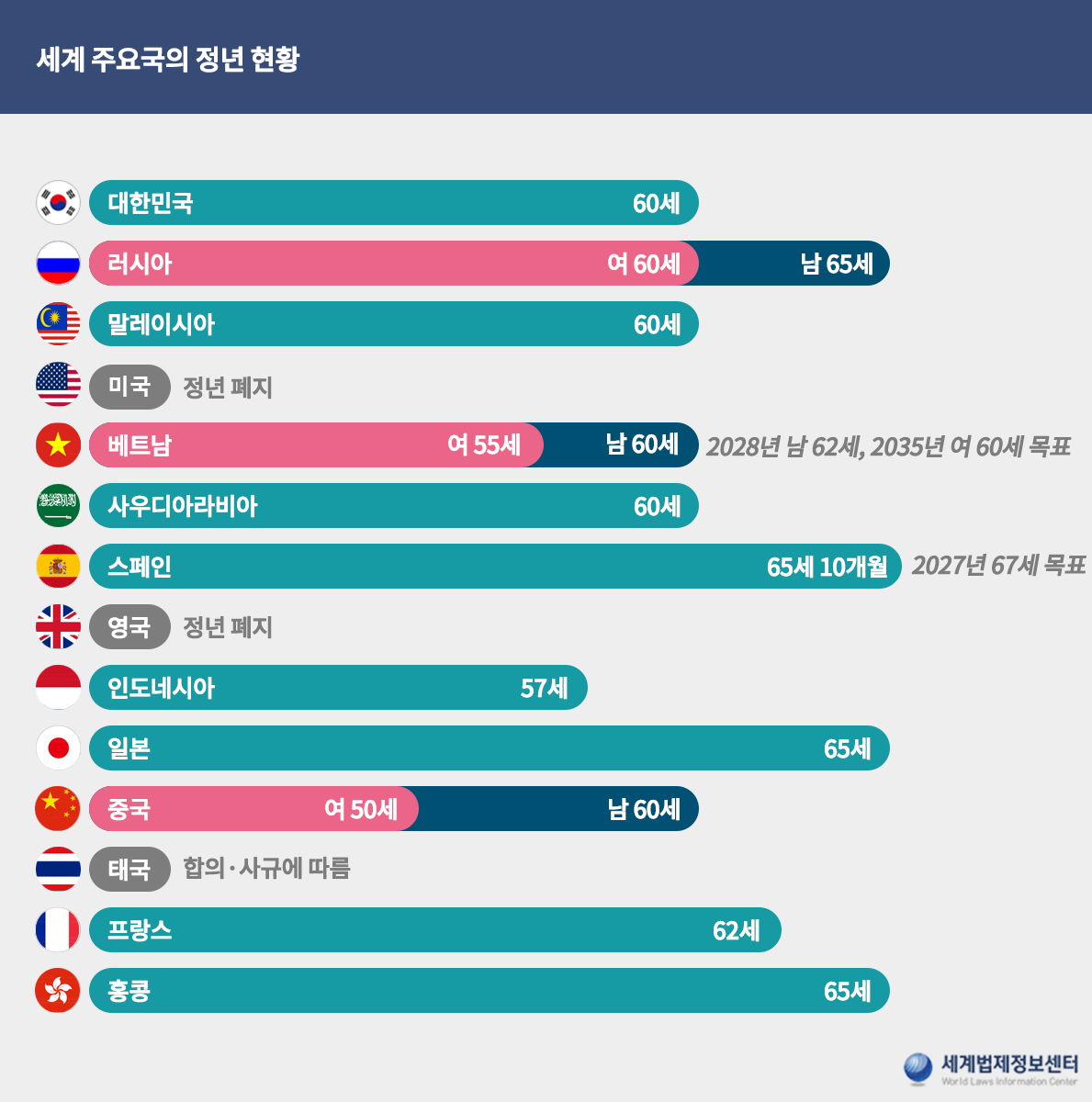 대한민국의 경우는 60세 이상이나 직업에 따라 다르다.