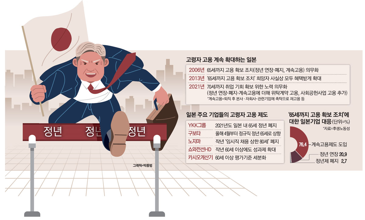 - 동아시아일본은 2021년 4월 1일 부로 직장인의 정년을 70세로 연장 조정하였으며 중국 역시 2022년부터 직장인 정년을 70세로 연장할 방침이다. 즉 70세 이전을 정년으로 하는 것이 불법이라는 것이다.