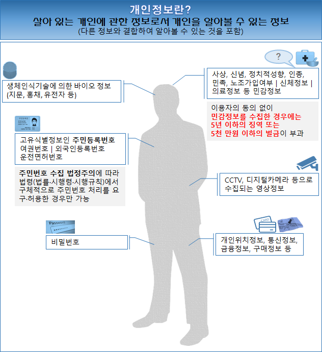 이후의 소문서에도 명시되어 있지만, 2016.9.30 새로 시행된 「개인정보 보호법」제2조(정의) 1에 따르면, "개인정보"란 살아있는 개인에 관한 정보로서 성명, 주민등록번호 및 영상 등을 통하여 개인을 알아볼 수 있는 정보(해당 정보만으로는 특정 개인을 알아볼 수 없더라도 다른 정보와 쉽게 결합하여 알아볼 수 있는 것을 포함한다)를 말한다.