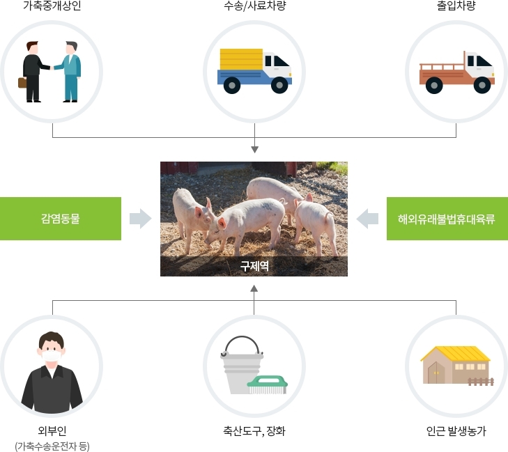 감염된 동물의 침, 정액, 수포액, 똥오줌에 오염된 물을 먹거나 직접적인 접촉으로 전파사람, 차량, 기구 등에 바이러스가 묻어서 다른 동물에 전파감염된 동물이 숨쉬거나 재채기할 때 공기를 통해 바이러스 전파이 외에도 검역되지 않은 농축산물, 국제우편, 외국인 근로자, 황사 등을 통해서 유입 가능하다는 추정들이있다.