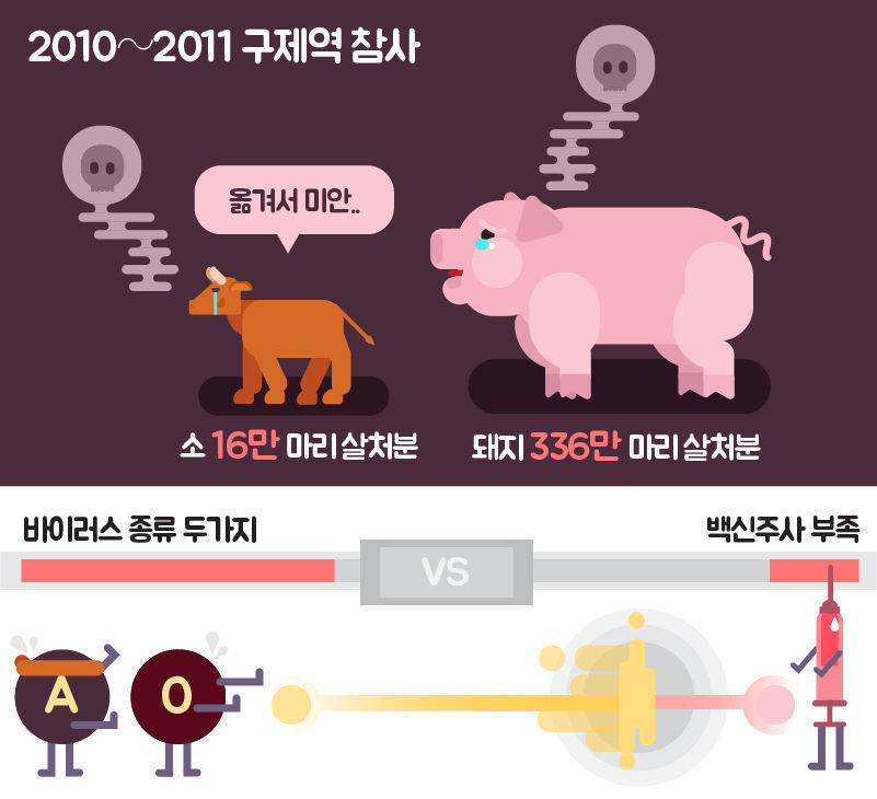 유리, 돼지 이야기, 이야기꽃, 2013내용 참조결국 2000년과 2002년에 걸친 두 번의 구제역 사태 이후에도 제대로 된 예방 및 대응책이 마련되지 않은 무능과 과거보다 더 밀집화된 축산업은 2011년 2월까지 약 345만 마리의 가축을 살처분하는 대재앙의 방아쇠가 되었다.