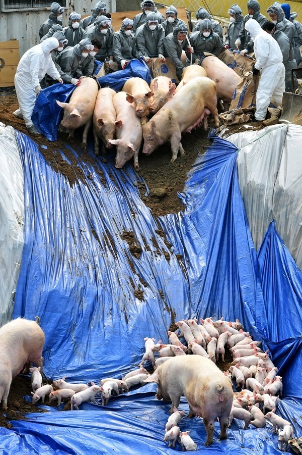돼지들은 영문 모른 채 몽둥이와 전기막대에 맞으며 우르르 쫓겨 갔지요.가축전염예방법은 가축을 살처분할 때 산 채로 구덩이에 파묻지 못하도록 정하고 있습니다.