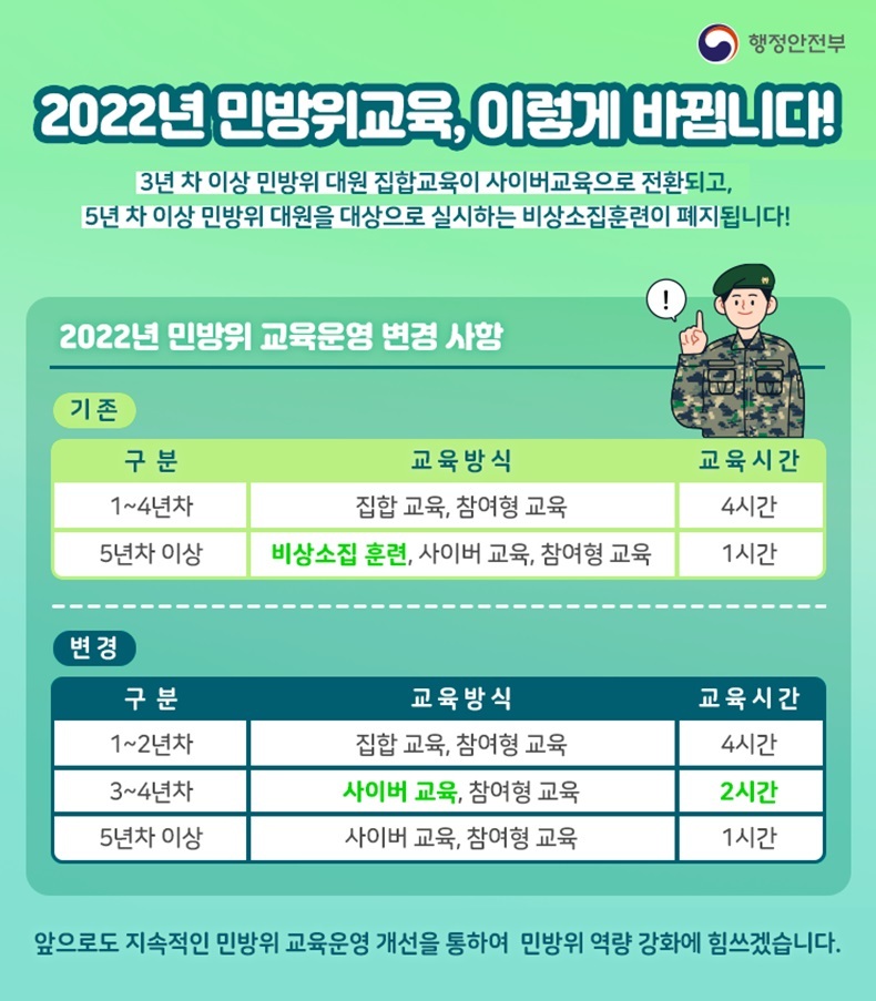 2022년부터 시행되는 신 규정에 따르면 민방위 1~2년차까지는 1년에 집합교육 1번 4시간, 3~4년차까지는 1년에 온라인 교육 2시간 1회, 5년차부터 만 40세까지는 1년에 온라인 교육 1시간만 받는다.