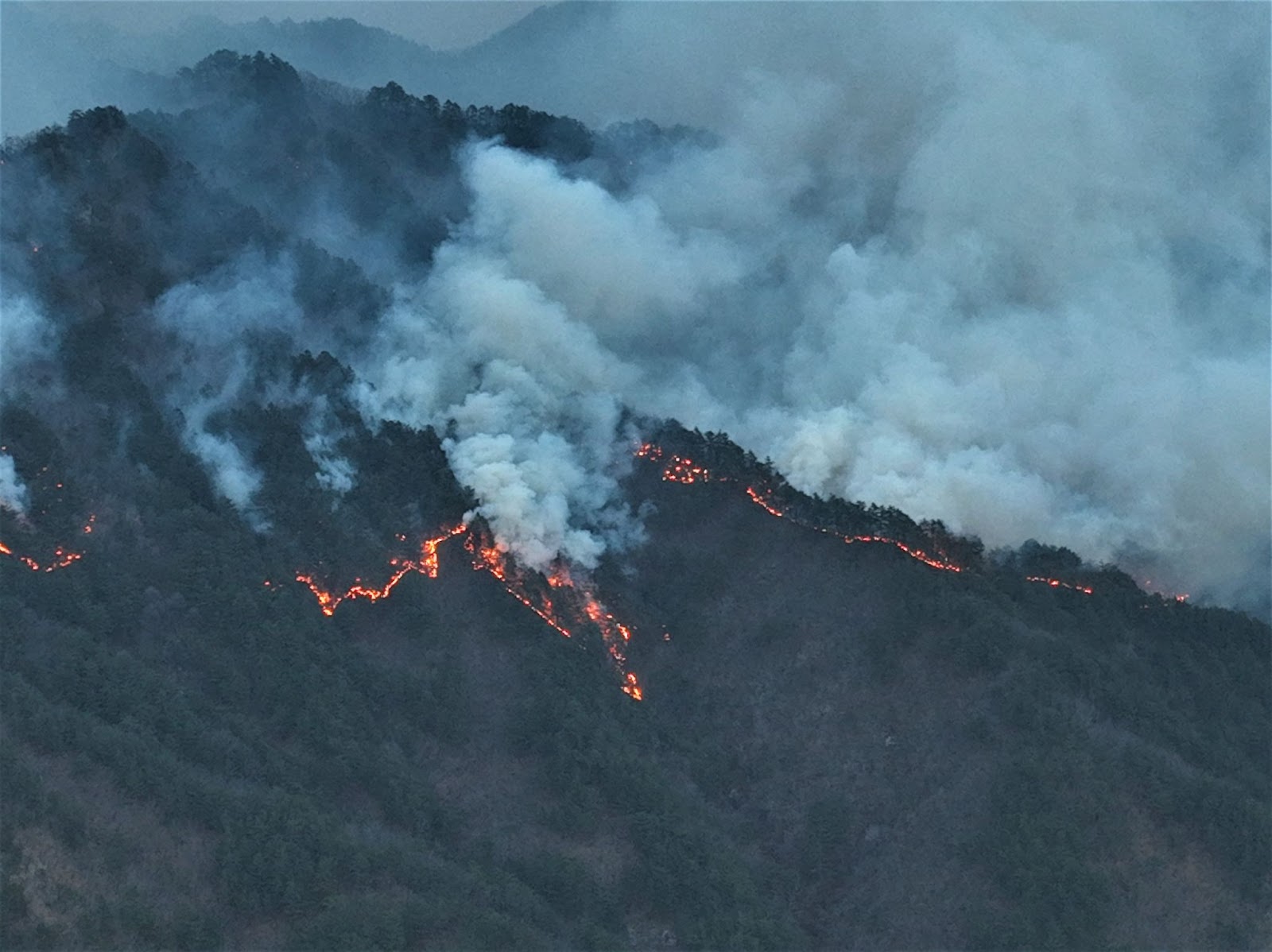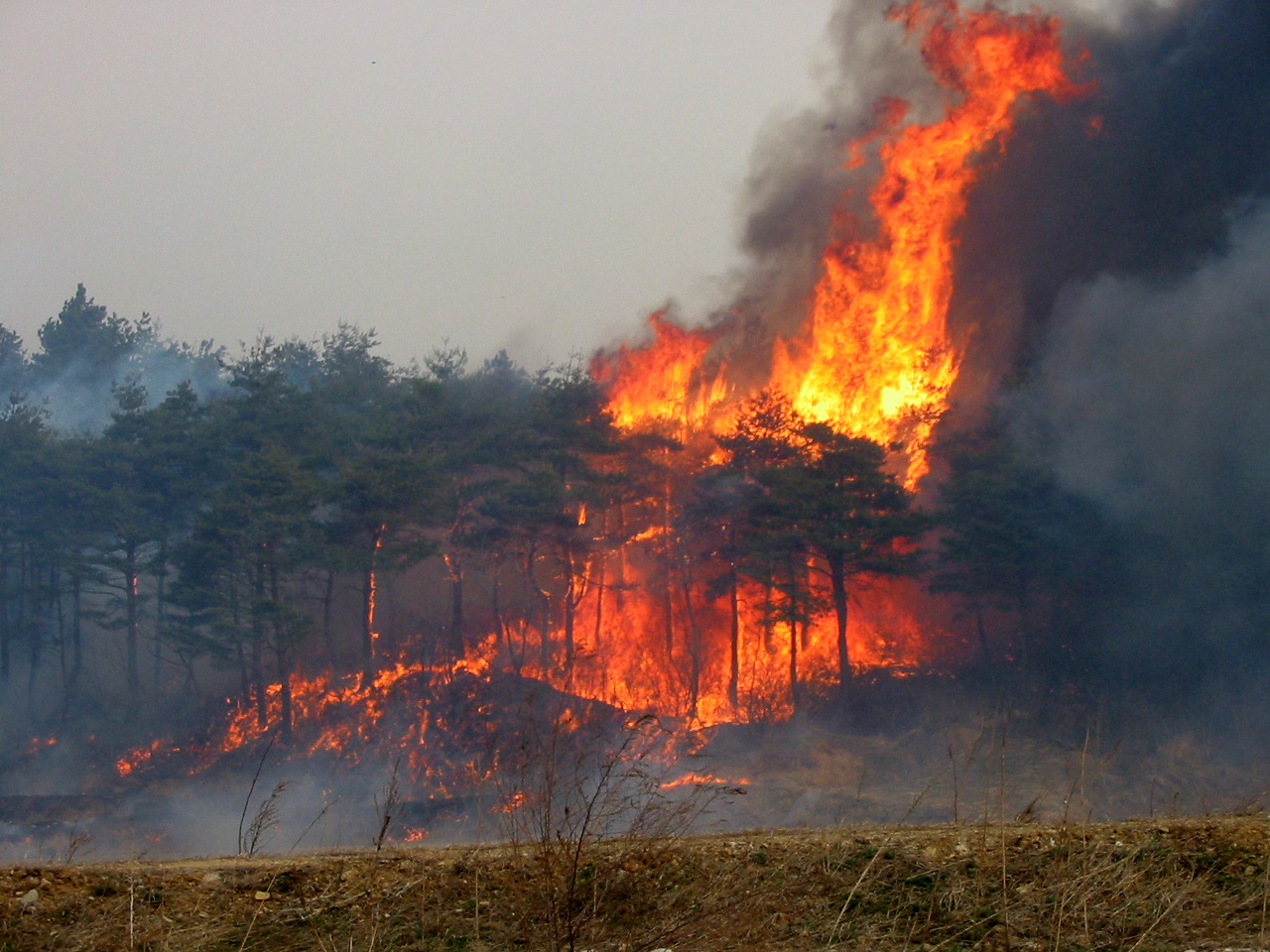 특히 눈이나 비가 한동안 안 오고 습도가 낮은 날씨에 바람까지 부는 상황에서 불이 난다면... (따라서 여름이라는 우기를 거친 가을보다, 겨울-봄을 거친 봄에 산불이 더 자주 발생한다). 이때 불이 번지면 훅~하는 사이에 산의 대부분이 탄다고 보면 된다.