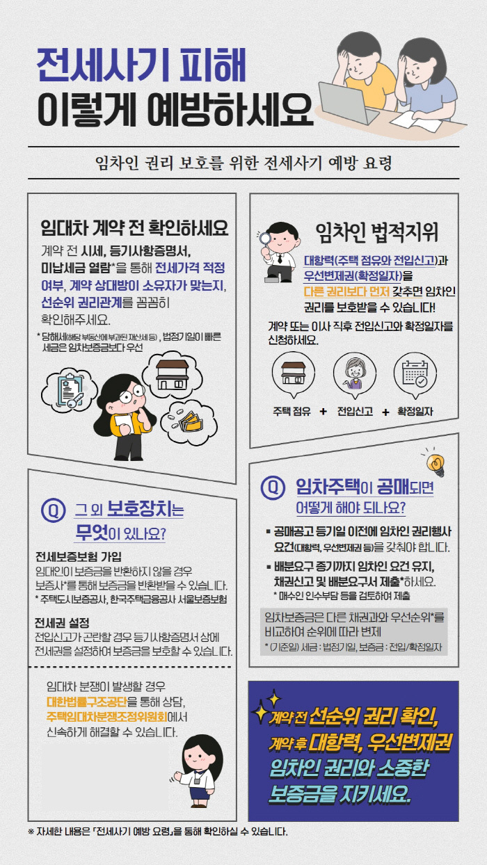 - 사기 예방에 있어 제일 좋은 것은 등기부등본을 꼼꼼히 확인하고 미심쩍은 집은 계약을 하지 않는 것이다. 미리 임대차계약을 맺기 전 부동산 등기부등본을 떼보는 것이 매우 매우 매우 중요하다. 부동산에 가서 마음에 드는 집이 있다고 하면, 공인중개사에게 그 집의 등기부등본을 떼달라고 하면 그자리에서 떼준다. 등기부등본을 통해서 신탁여부, 저당액, 선순위 채권 등을 모두 알 수 있기 때문에 계약 전 꼭 미리 확인해보아야 한다. 특히 근저당이 설정되는 갑구뿐만 아니고 을구도 전부 확인하여야 한다. 어떤 이들은 등기부등본 보는게 의미가 없다고 하는 경우가 있는데 100% 모든 사기를 막을순 없지만 등기부등본을 통해서 그 물건의 위험도를 간략하게나마 확인할수 있다. 따라서 전세사기, 또는 전세보증금을 날릴 수 있는 위험도를 조금이라도 줄이기 위해서는 반드시 확인해봐야 한다. 계약 후 등기부등본을 확인해보는 것도 필요하다. 계약 때는 깨끗했던 등기부등본이 나중에 바뀌어있는 사례도 빈번하기 때문. 집의 시세를 대략이라도 파악해보자. 통상 전세가+대출액이 시세의 70%를 넘으면 깡통주택이라고 판단한다. 전세가와 시가가 비슷하다면 전세사기가 아니더라도 무리한 갭투자매물일 수 있으므로 권하지 않는다. 마찬가지로 근저당권 설정, 즉 대출액이 큰 경우도 전세계약은 위험하다. 신축 빌라는 전세로 들어가서는 안된다. 최소한 5년 정도 된 주택을 골라야 한다. 굳이 신축을 골라야 한다면 지역별로 다르게 설정되어 있는 보증금을 최우선변제로 받을 수 있는 한도까지만 놓고 월세를 택해야 한다. 전세는 해당 주택에 대한 권리분석과 시세 판단을 집주인보다도 더 정확하게 할 수 있어야 한다. 하지만 주변 시세를 보고 판단할 수 있는 구축 빌라는 권리분석을 어느정도 할 수 있지만 신축은 그게 사실상 불가능하다. 만약 신축빌라에 입주하려 하는데 이사비나 보증금, 혹은 이자를 지원해주겠다는 달콤한 조건을 내건다면 이는 전세사기일 가능성이 크므로 응하지 말자. 그 돈 다 임차인의 주머니에서 나가는 돈이다.
