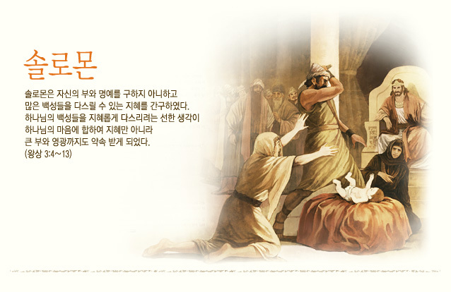 ...(중략)... "그러하오니 소인에게 명석한 머리를 주시어 당신의 백성을 다스릴 수 있고 흑백을 잘 가려낼 수 있게 해주십시오. 감히 그 누가 당신의 이 큰 백성을 다스릴 수 있겠습니까?"이러한 솔로몬의 청이 야훼의 마음에 들었다.