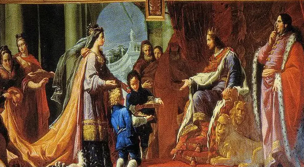 공동번역 성서, 열왕기상 3장 16~28절한 명의 아이를 가지고 다투는 두 여인 앞에서 아이를 반으로 나누자고 함으로써 진짜 어머니를 찾아 내고 거짓말을 한 여인을 처벌을 내리는 이야기가 유명하다.