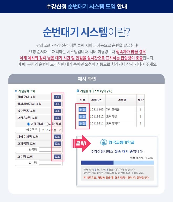 그 이후에는 기존의 선착순 방식과 유사한 대기순번제 방식을 적용하며, 신입생, 2~3차 복학생 수강신청 및 수강변경, 계절제 수업의 수강신청에도 대기순번제 방식을 적용한다.