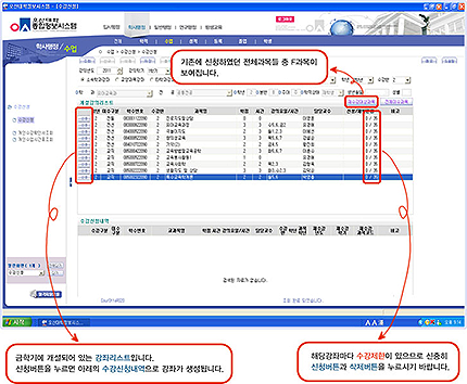 그래서 교양과목의 경우 학생마다 자기가 듣고 싶은 강의를 선택할 수 있도록 허용한 것이 '수강 신청 제도'이다.