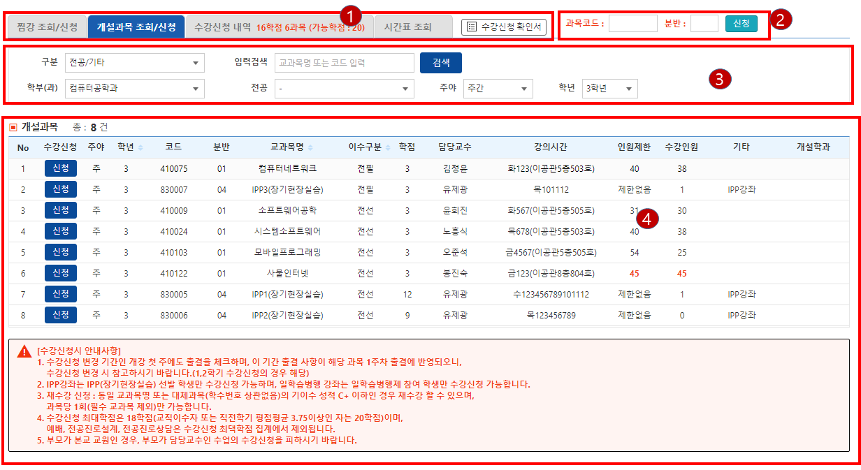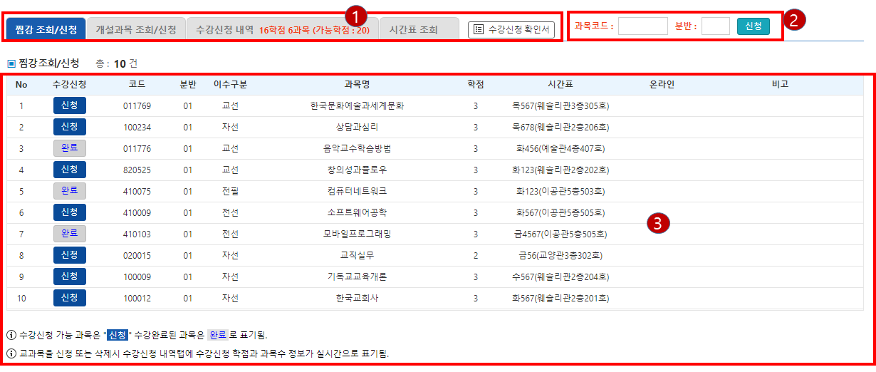 - 과목별로 배당된 코드를 입력해서 신청