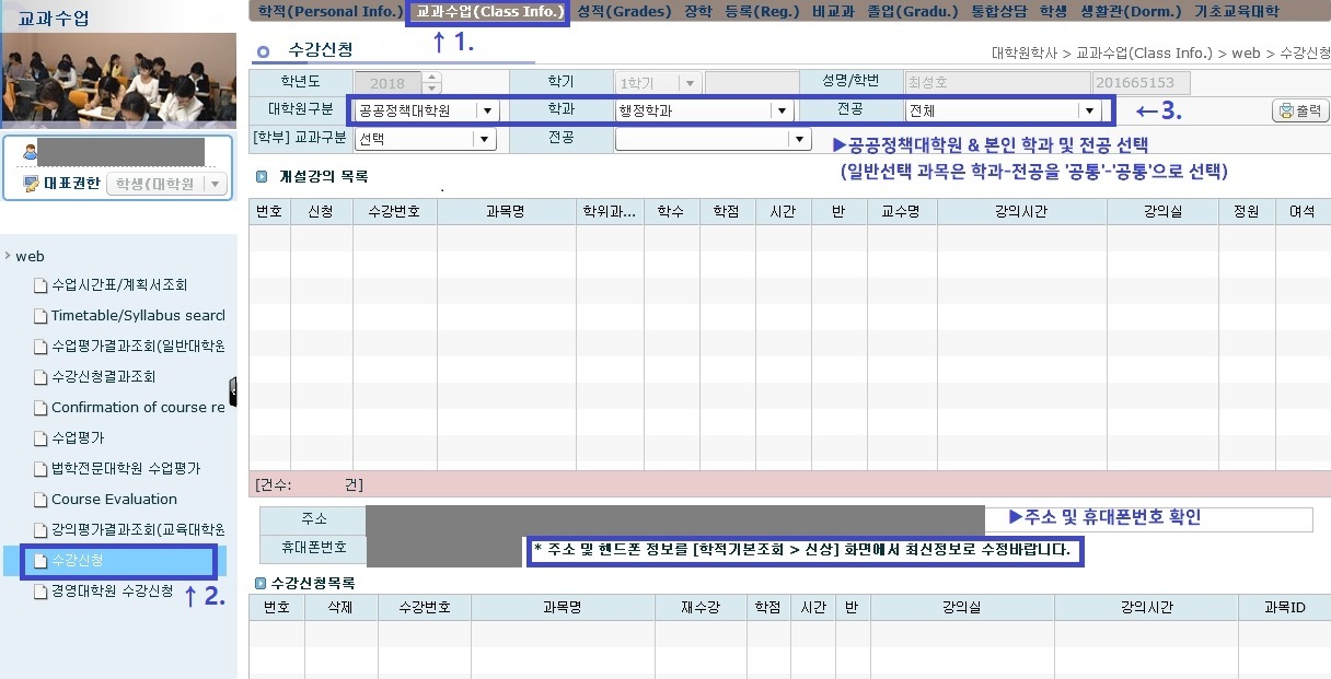 이 때 수강 과목을 새로 신청하거나, 변경 및 취소가 가능하다.
