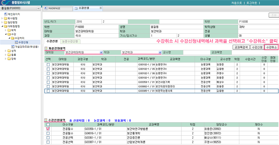 해당 학년의 전공은 이미 전학교에서 이수했으면 해당 학년의 같은 과목을 신청 못한다.